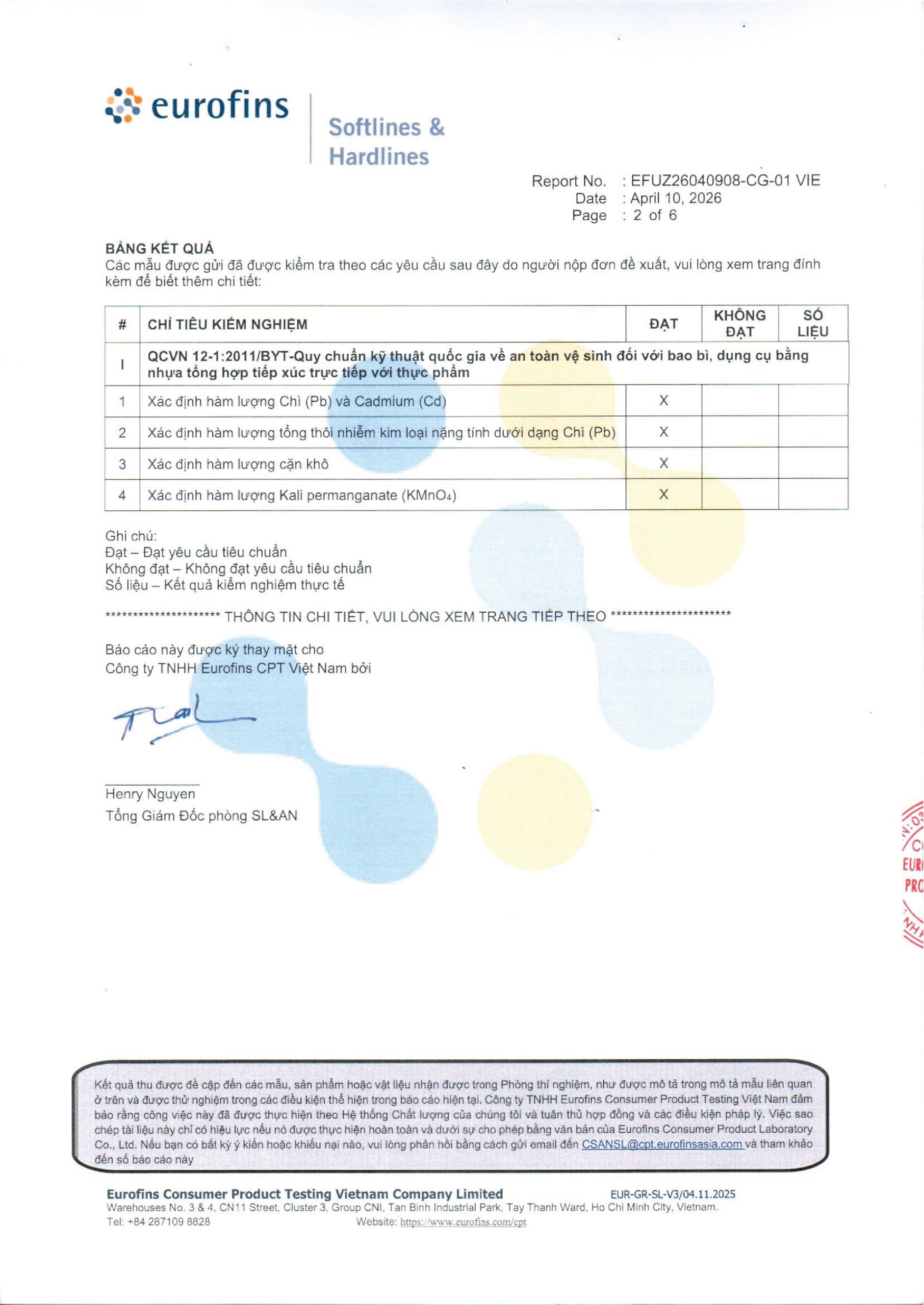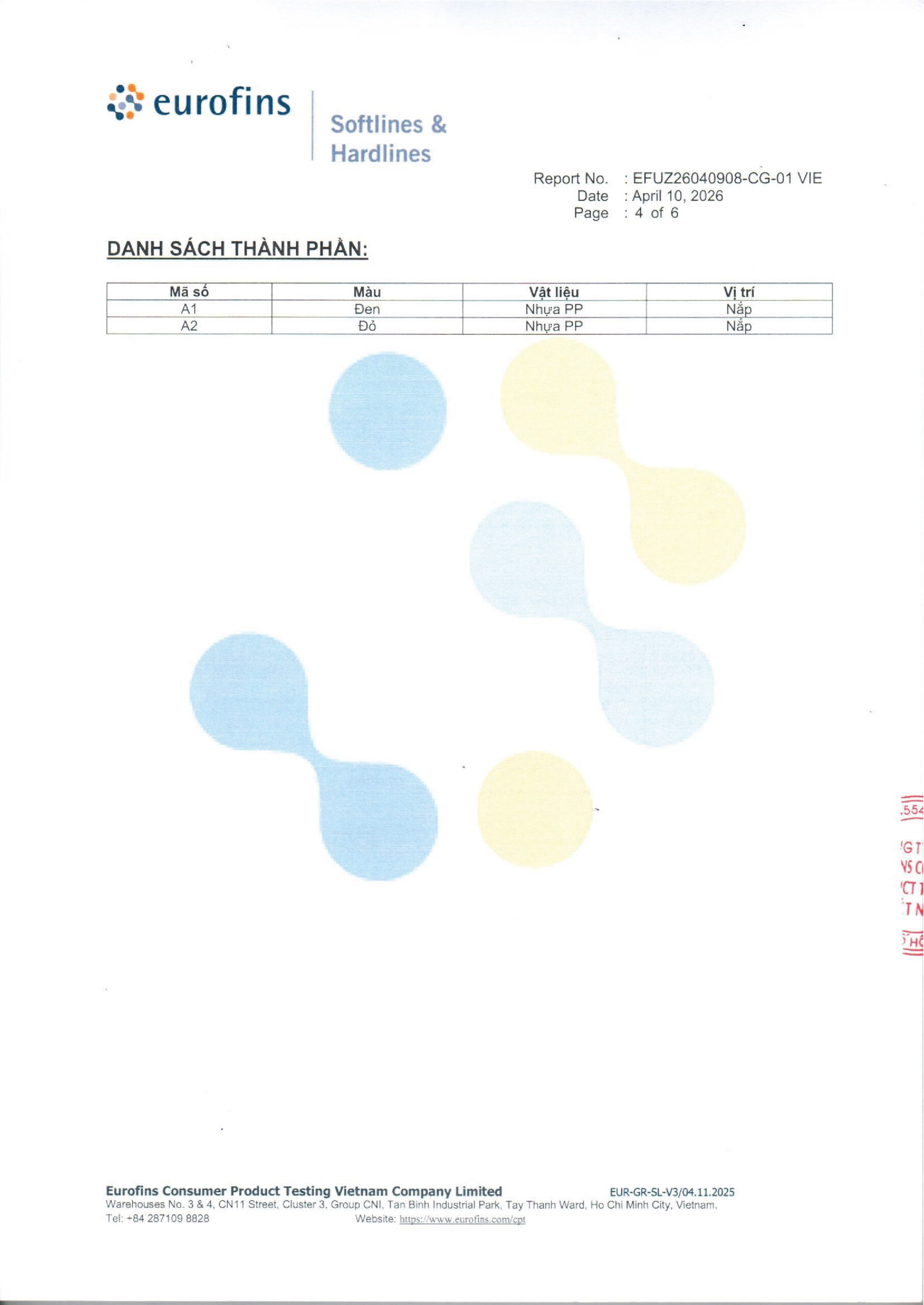- Thành phần cấu tạo, vật liệu tiếp xúc thực phẩm: Nhựa PP